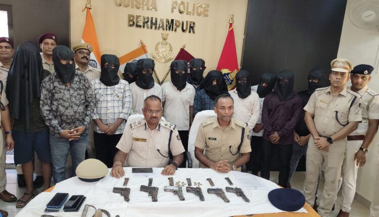 Berhampur: In a significant operation aimed at curbing criminal activities, Berhampur Police arrested 12 notorious anti-socials and seized 6 pistols, 12 rounds of live ammunition.
