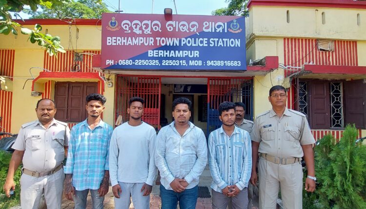 The arrested persons have been identified as Sameer Jena (20) of Prahallad Nagar, 4th Lane, Berhampur; Jogendra Hati (27) of Old Berhampur, Sita Dhimira Sahi; T. Akash (26) of Mangalabarpetta, Reddika Sahi and K. Charana Kumar (20) of Prahallad Nagar, 4th Lane, Berhampur.