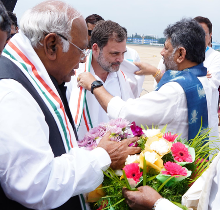 Karnataka State Congress President and Deputy Chief Minister D.K. Shivakumar, along with AICC General Secretary and Karnataka in-charge Randeep Singh Surjewala, welcomed him at the airport. Party’s national President Mallikarjun Kharge also arrived with Rahul Gandhi.