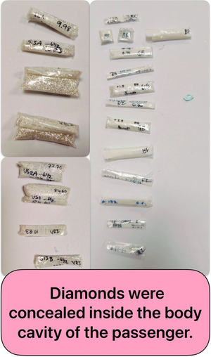 In a separate incident, customs officials, acting on another specific input, intercepted a passenger preparing to board a flight to Dubai. Upon thorough inspection, they discovered a stash of cut and polished diamonds concealed within the passenger’s body cavities.