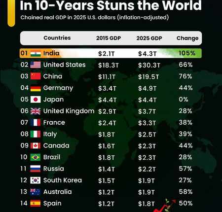 New Delhi: India’s GDP has surged from $2.1 trillion in 2015 to an estimated $4.3 trillion in 2025, reflecting an impressive 105 per cent increase, according to inflation-adjusted data from the International Monetary Fund (IMF).