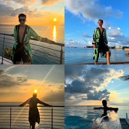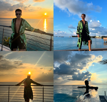 The photos have Karan posing in a stylish floral robe, paired with black shorts, and matching sunglasses. While the director is standing on the wooden deck overlooking the ocean in the first two photos, he faces the camera from inside the pool in the next set.