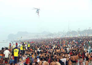 This flower shower added to the festive atmosphere and symbolised divine blessings for the devotees as they took part in the sacred bath on Maha Shivratri.