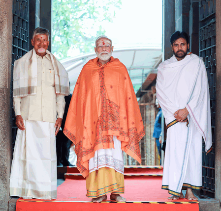 Temple priests and officials welcomed PM Modi, CM Naidu and Deputy CM at the main entrance of the temple. They participated in various rituals at the temple.