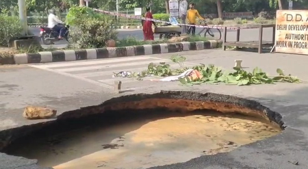 In a similar incident on August 18, a large pit formed in the middle of a road in Delhi’s Burari area, causing a car to plunge into it.