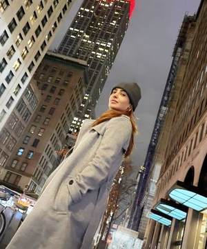 The picture features Samantha Ruth Prabhu dressed her a cozy winter attire with a long overcoat and wollen cap as she stands next to a tall building.
