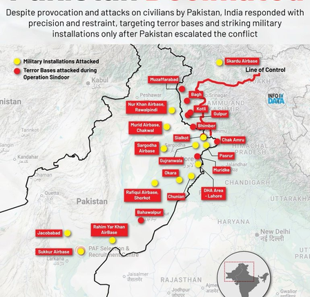 He also mentioned 11 Pakistan bases which were attacked and rendered useless. He said each of these bases served a critical function, and its destruction inflicted strategic and psychological damage on the Pakistani military establishment.